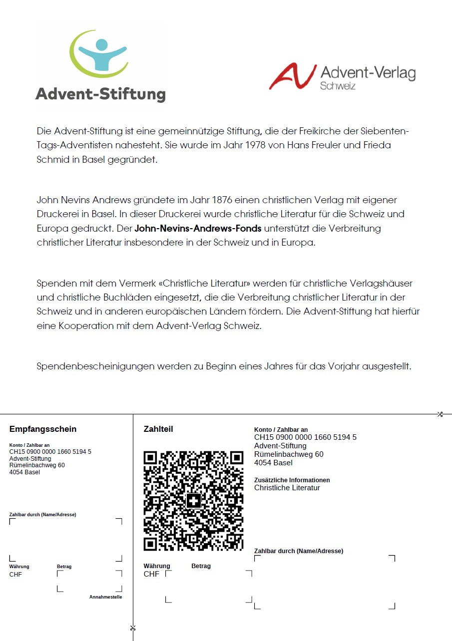 John Nevins Andrews gründete im Jahr 1876 einen christlichen Verlag mit eigener Druckerei in Basel. In dieser Druckerei wurde christliche Literatur für die Schweiz und Europa gedruckt. Auch die Advent-Stiftung unterstützt 150 Jahre später die Verbreitung christlicher Literatur insbesondere in der Schweiz und in Europa.